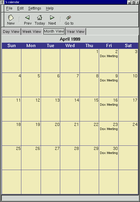 The Month View shows the entire month with brief detailed descriptions of your appointments. The Month View makes use of the customized colors available in the Calendar. You can read about how to set these colors in the section called Setting Up the GNOME Calendar. For any day with a brief description of an appointment you can click on the day to display a detailed description of the appointment in a pop-up window. If you would like to add an appointment to a day in the Month View you can right mouse click on any day and select the New Appointment in this day item from the pop-up menu. You can use the items in the pop-up menu to navigate in the Day, Week, and Year views by selecting either Jump to this day, Jump to this week, or Jump to this Year.