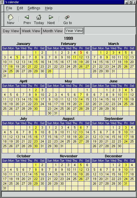 The Year View shows you the entire year with no descriptions of appointments. Like the Month View, the Year View makes use of the customized colors available in the Calendar. You can read about how to set these colors in the section called Setting Up the GNOME Calendar. If you have an appointment on a day you can click on that day and a description of the appointment will be displayed in the pop-up window. If you would like to add an appointment to a day in the Year View you can right mouse click on any day and select the New Appointment in this day item from the pop-up menu. You can use the items in the pop-up menu to navigate in the Day, Week, and Month views by selecting either Jump to this day, Jump to this week, or Jump to this Month.