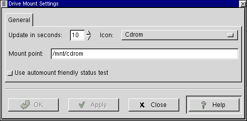 The Drive Mount Applet allows you or your systems administrator to mount a drive on your system by simply clicking the icon on your Panel. In order for this to work you will to have to set the drive you want to access to be user mountable.